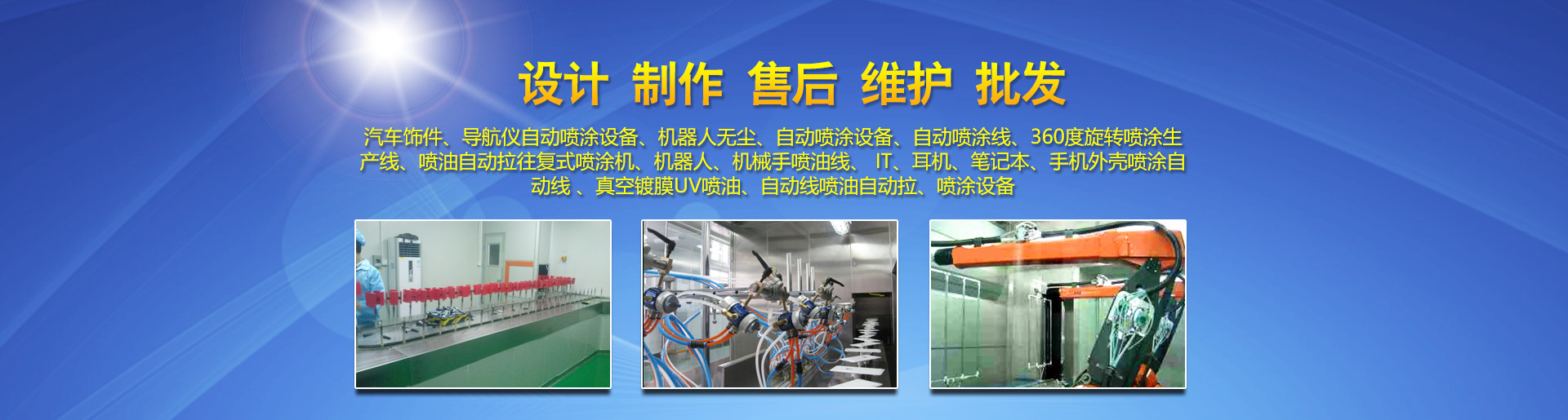 主要生產:機器人自動噴涂、汽車內飾件噴漆設備、Spindle噴漆設備、UV自動噴漆設備、自動噴漆生產線、無塵噴漆設備、塑膠外殼全自動噴漆設備等自動化設備。